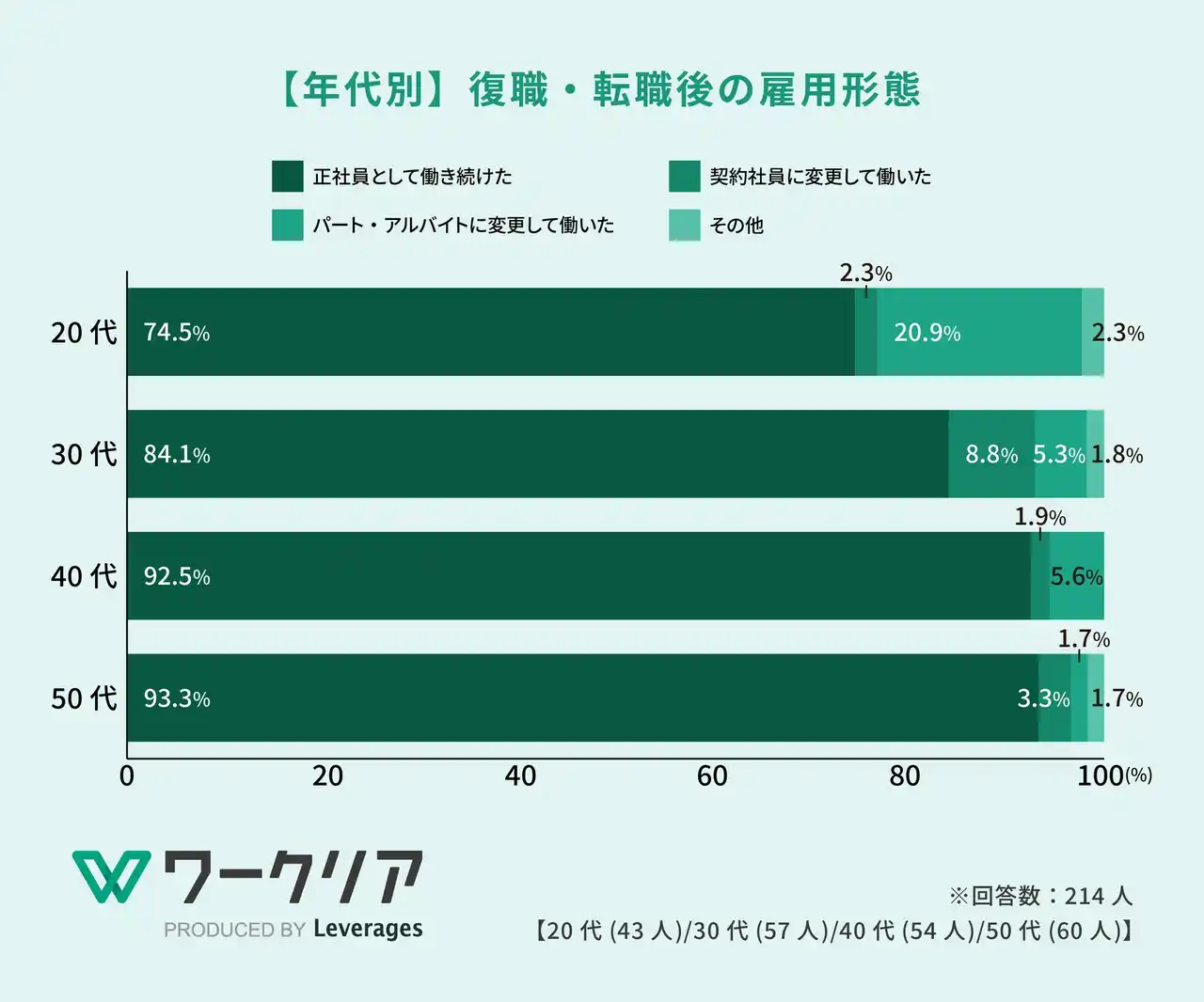 復職または転職をした人の雇用形態については、約87%が「正社員(86.9%)」と回答しましたが、1割以上が「契約社員(4.2%)」や「パート・アルバイト(7.5%)」へと雇用形態を変更していることが分かりました。休職によってその後の働き方やキャリア形成に影響を与えていることが考えられます。 |