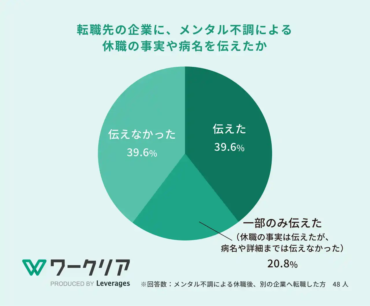 復職または転職をした方を対象に、再度メンタルヘルス不調を理由に休職したことがあるか聞くと、約半数が「再休職の経験がある(53.7%)」と回答しました。別の企業への転職者でも約4割が再休職をしています。病名や休職の事実については、転職先に「伝えなかった(39.6%)」と回答した方が約4割に上りました。 |