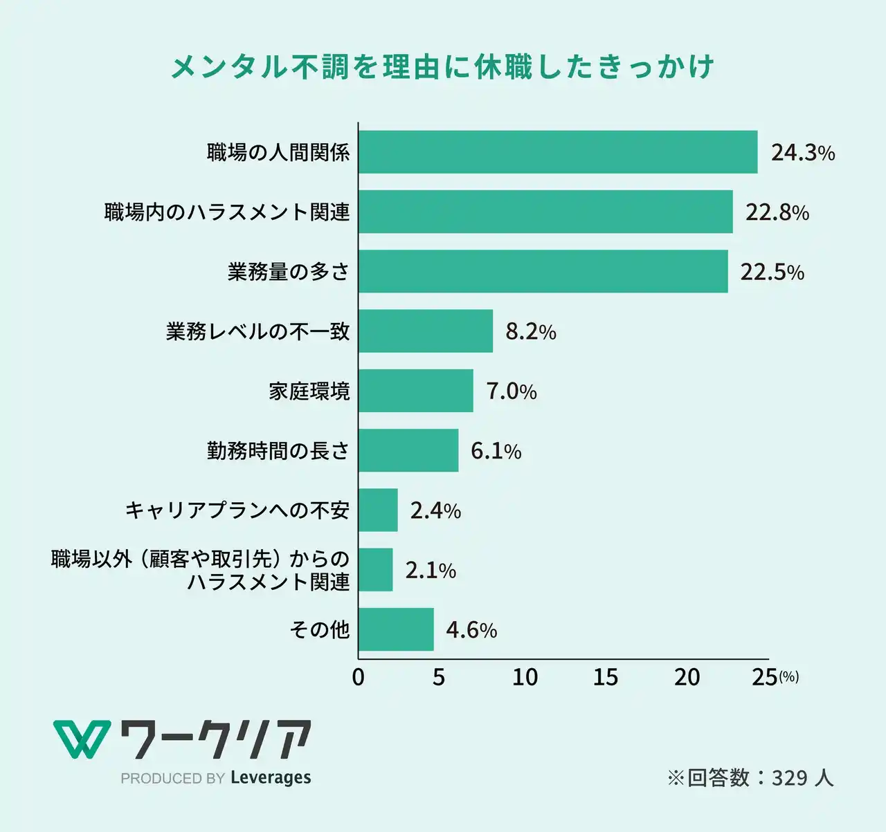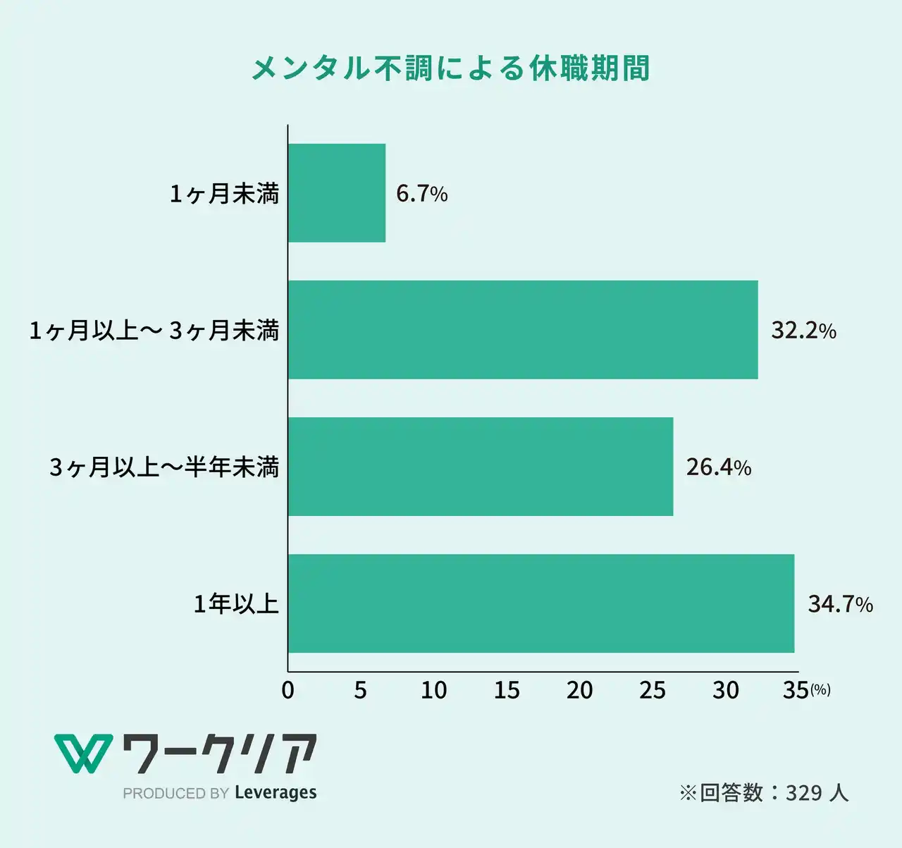 レバレジーズ株式会社が運営する障がい者就労支援サービス「ワークリア」( https://worklear.jp/ )は職場におけるメンタルヘルス不調の増加を受け*1、正社員として勤務していた際にメンタルヘルス不調で休職したことがある20~60歳の男女329名を対象に、メンタルヘルス不調による休職者の実態調査を実施しました。 |