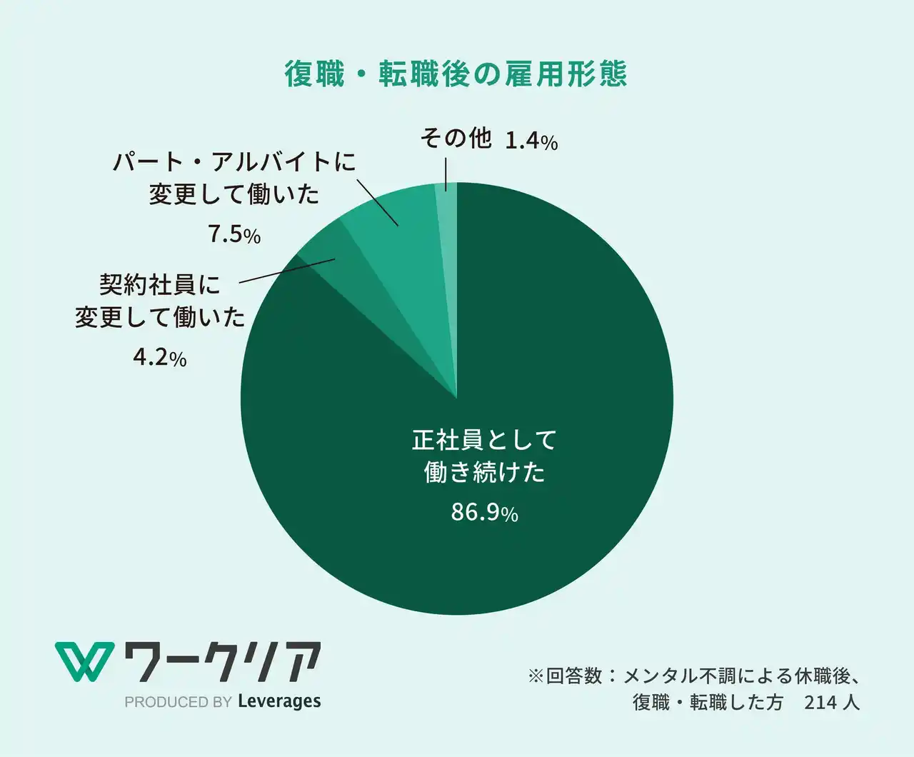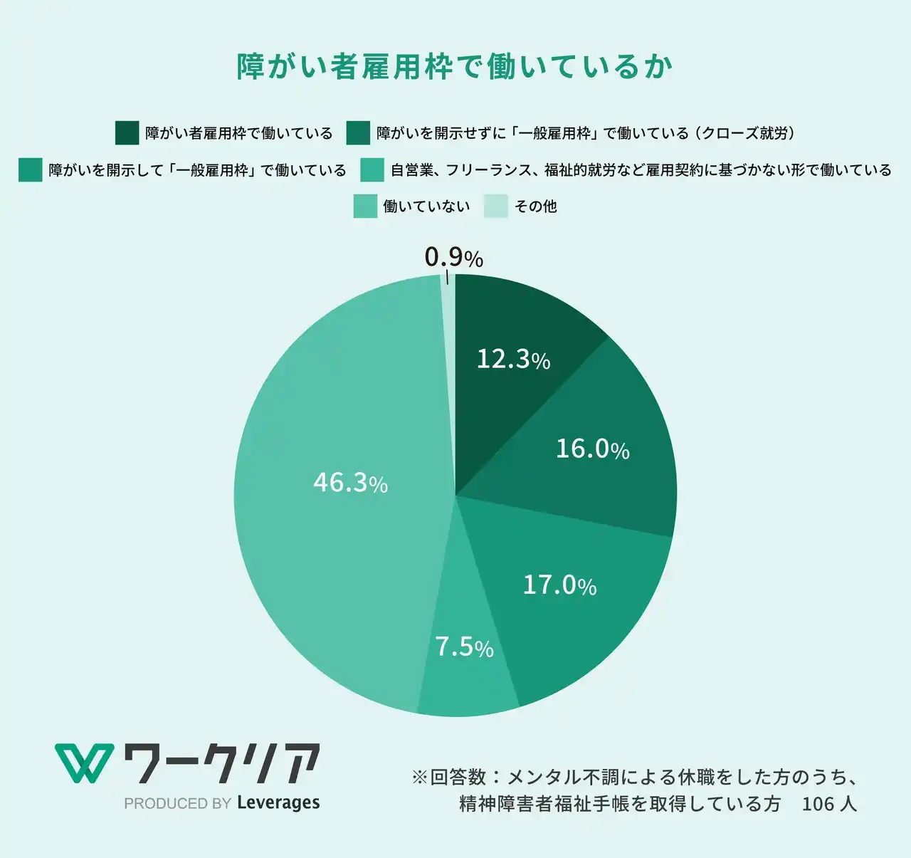 メンタルヘルス不調による休職をした方のうち、約3割が精神障害者保健福祉手帳を取得しています。手帳取得後の就労状況は、約10人に1人が障がい者雇用枠、約6人に1人は障がいを開示せずに働く「クローズ就労」を選ぶなど、多様化していることが分かりました。 |