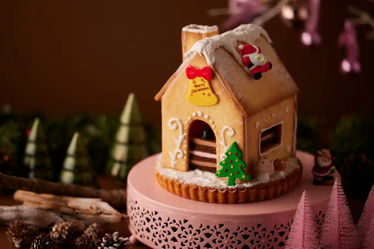 「ヘクセンハウス」は、当ホテルのクリスマスイベントでロビーに登場するお菓子の家「メゾン・ド・ノエル」をイメージしたケーキです。バターの風味豊かなクッキーでできた家の中には、フルーツを飾ったチョコレートケーキが隠れています。大人からお子様まで笑顔になれる、夢のある一品。ご家族との特別なひとときにぴったりです。 |
