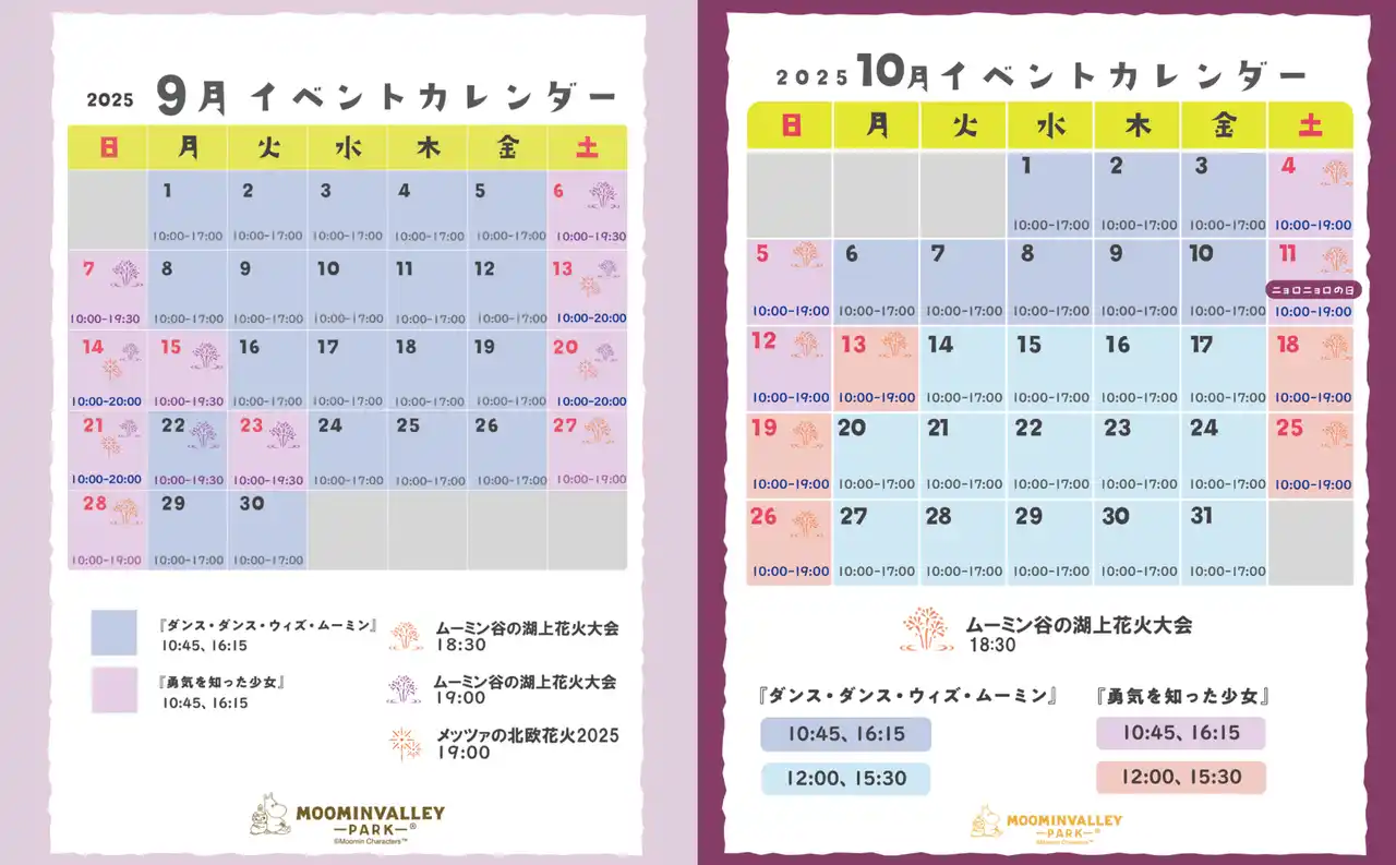 | ※少雨決行、強風荒天中止。中止情報についてはムーミンバレーパーク公式サイト、SNS 等でお知らせいたします。また予告なく打ち上げ時間を変更する場合もございます。 | ||||||||||||||