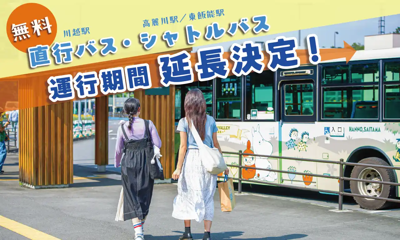 | JR埼京線・川越線・八高線、東武東上線、西武鉄道の沿線にお住まいのみなさまをはじめ、これまでムーミンバレーパークへのアクセスに不便を感じていらっしゃった方も、無料直行バスと無料シャトルバスのご利用で、より便利にムーミンバレーパークへお越しいただけるようになりました。 | ||||||||||||||