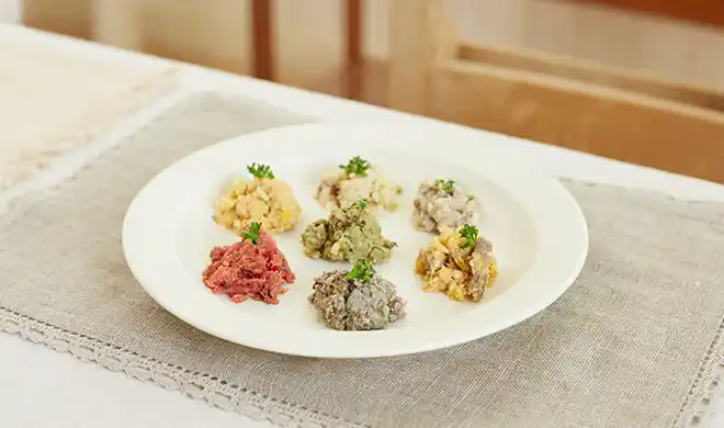 さまざまな食材を使用した7種類のメニュー:従来の7種類のメニューをそのままラインナップ。1つの商品に12品目以上、1週間で50品目 以上の食材を使用しています(※2)。愛犬の好みや体質に合わせて選択することも可能です。 |