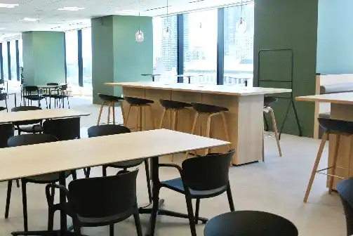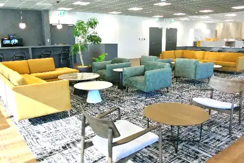ハイテーブルやボックス型ソファ席など、目的に応じて選べる設計としています。 |