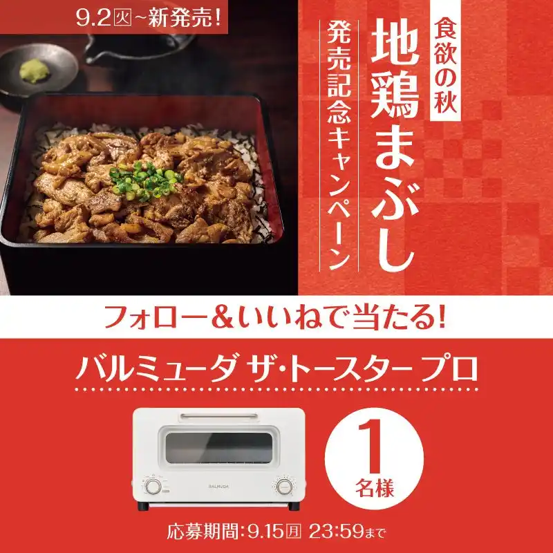 このたび日本国内の「やよい軒」では、やよい軒公式X・公式Instagramにおいて、『~徳島県産阿波尾鶏使用~地鶏まぶし定食』発売を記念して、Xでは「やよい軒お食事券」、Instagramでは「バルミューダ ザ・トースター プロ」が当たる!キャンペーンを実施いたします。 |