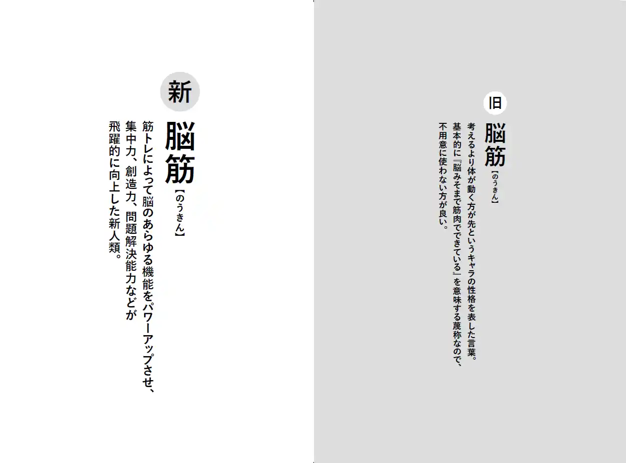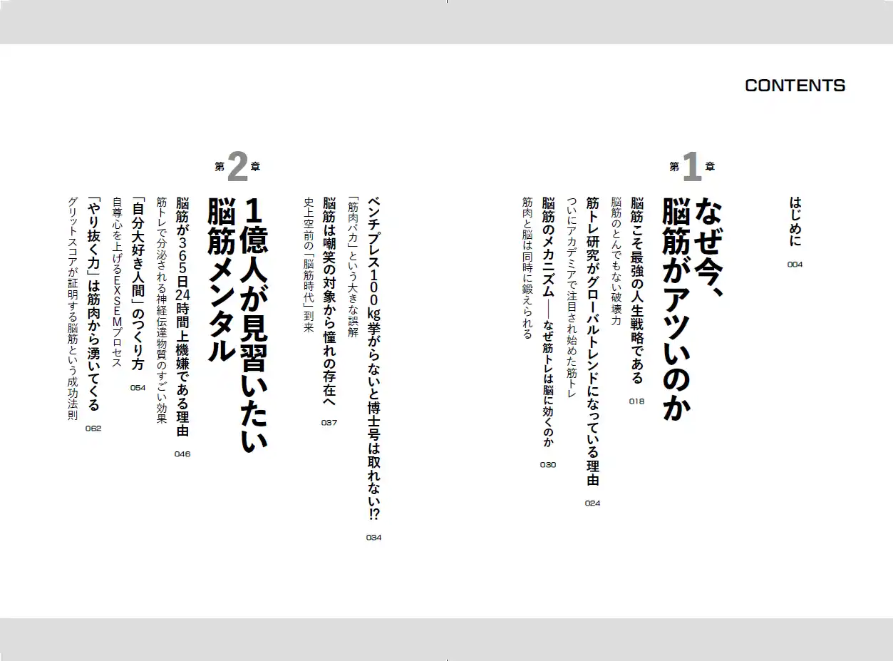 | 「脳筋」と聞くとどんな人が思い浮かぶでしょうか? 明るいけど単純で複雑なことは苦手な人? 後先考えずに行動する人? それとも鏡ばかり見ているナルシストでしょうか? そんなイメージはすでに過去のものと言えるかもしれません。近年運動と脳機能の関係に関する研究は飛躍的に進んでおり、筋トレをはじめとする運動は脳機能にポジティブな影響を与えることがわかっています。一例を挙げるだけでも、集中力、創造性、グリット(やり抜く力)、EQ(心の知能指数)、睡眠力、意思決定、認知機能の維持、メンタルヘルスの改善、自己肯定感の向上……etc。体を鍛え、「脳筋」として生きるだけで、自動的に脳がパワーアップし、あらゆる面でのパフォーマンスが向上する上、明るく楽しくポジティブに生きられる。脳筋とはもはや悪口ではなく、最強のマインドセットであり、ライフスタイルなのです。 | |||