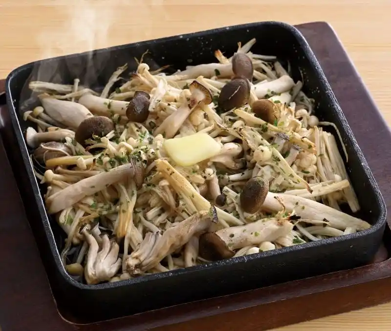 旬の“きのこ”2種類をたっぷり使い、使用。熱々の鉄板から立ちのぼる香りるバターが食欲をそそります。コク深いバターと“きのこ”の食感が絶妙に重なりと濃厚な旨みが引き立ち、シンプルだからこそ、な調理ながら素材の旨味力を存分に楽しめる味わえる逸品です。 |