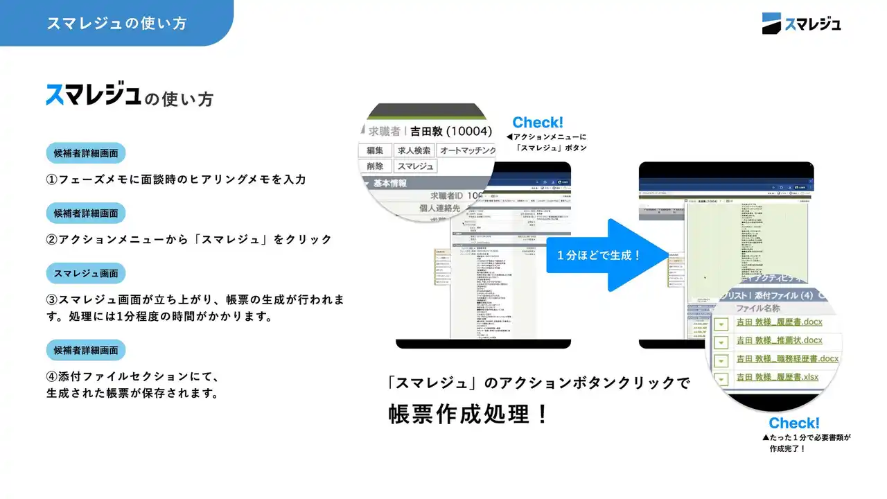 書類作成の所要時間を圧縮し、面談数・推薦着手までのリードタイム・書類通過率などのKPIに好影響を与えることが期待されます。さらに、PORTERSとスマレジュの連携により、面談メモ入力から帳票生成・候補者レコードへの自動添付までが途切れなくつながるシームレスな書類作成フローを構築し、生成書類をPORTERS上で一元管理できます。 |