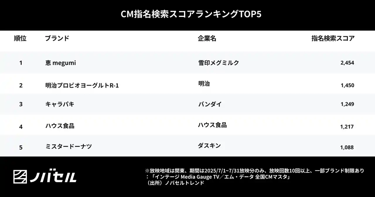 ソフトウェアとプロフェッショナル人材の力でマーケティングの民主化を目指すノバセル株式会社(本社:東京都港区、代表取締役社長:田部正樹、以下ノバセル)は、テレビCM効果の分析サービス「ノバセル トレンド」を活用し、2025年7月に放映されたテレビCMの指名検索スコアランキングを発表します。 |