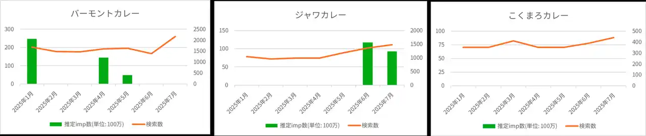「ハウスカレー」の検索数とCM放映量の相関を見ると、CM放映とキャンペーンが同時に始まった7月に検索数が大きく上昇しました。キャンペーン対象の3商品も、いずれも7月に検索数が増加しており、個別のテレビCM放映がなかった「バーモントカレー」と「こくまろカレー」も同月に検索を伸ばしています。 |