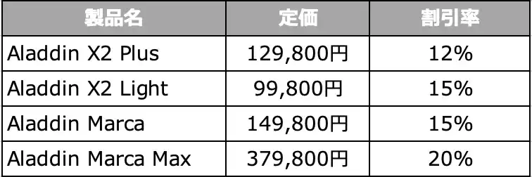 本セール対象製品は、超短焦点プロジェクター「Aladdin Marca Max」「Aladdin Marca」や、照明一体型3in1プロジェクター「Aladdin X2 Plus」「Aladdin X2 Light」など、人気機種全4モデルです。 |