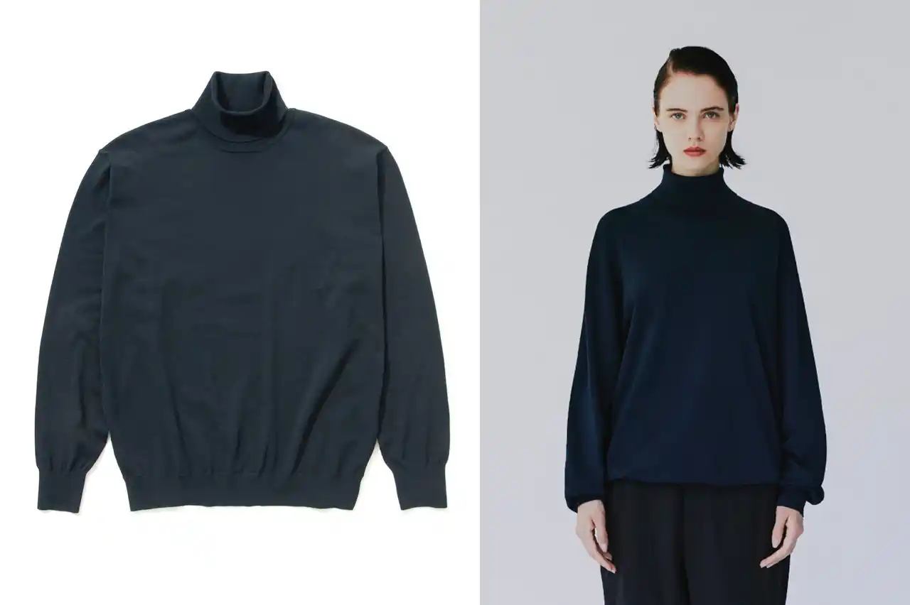 タートルネックニットは、無駄を削ぎ落としたミニマルなデザインに、マイクロファイバー素材の肘当てをアクセントとして配置。さりげない個性を加えつつ、洗濯可能な利便性も両立しました。 |