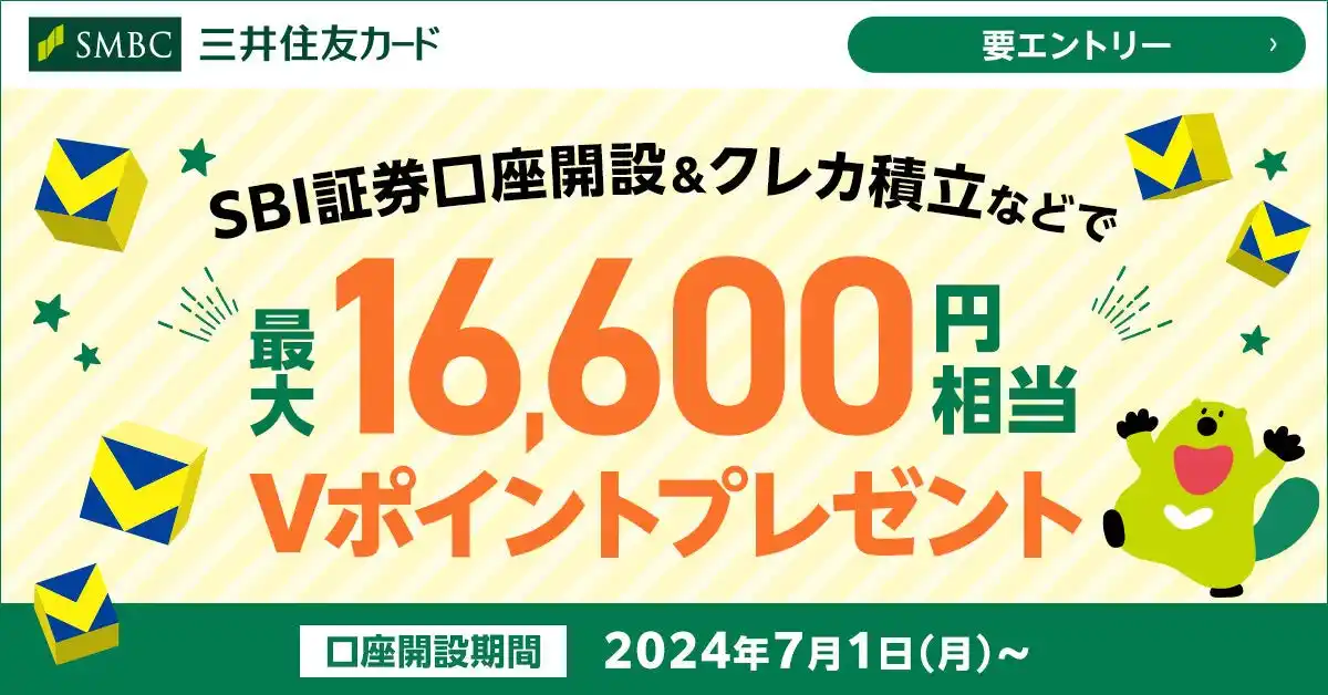 <特典 1> 三井住友カード経由で SBI 証券口座を新規開設の上、エントリーおよび 三井住友カード Vポイント認証(Vpass/SMBC ID 登録)を実施いた だくと、100 円相当のVポイントをプレゼント <特典 2> 特典 1 を達成し、クレカ積立をご利用いただくと、口座開設月 2 カ月後の 10 日積立設定締切分のご利用金額に対して、最大 2,500 円相当のVポイ ントをプレゼント <特典 3> 特典 1 および特典 2 を達成し、さらに株式などの各種商品の取引条件を 達成すると、口座開設月の 3 カ月後の10 日積立設定締切分のクレカ積立 ご利用金額に対して、最大14,000 円相当のVポイントをプレゼント |