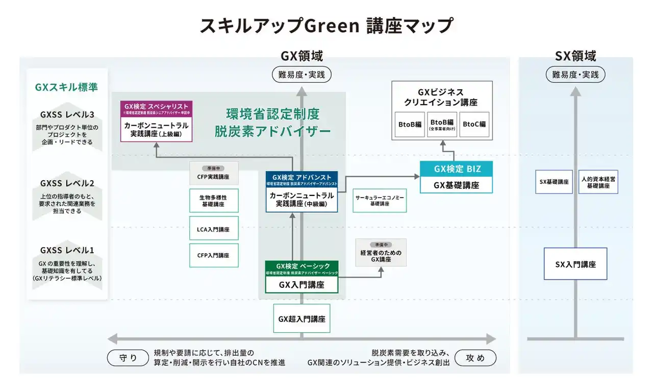 スキルアップNeXtは、「スキルアップGreen」でGXを体系的に学べる講座や、GX推進に必要な知識やスキルを測る「GX検定」で企業のGX推進をワンストップでサポートしています。 |