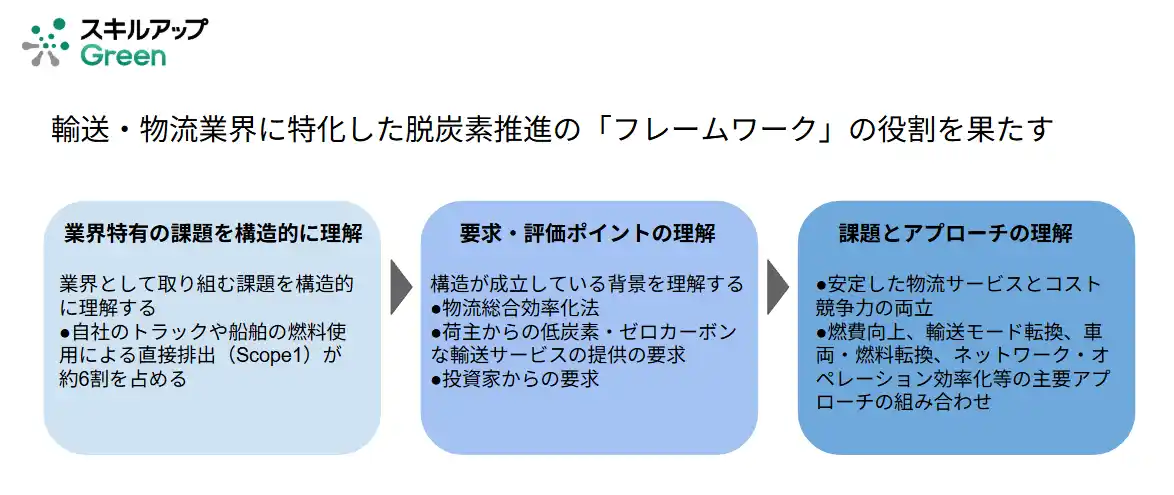 人材育成を通じて企業の脱炭素経営を支援する株式会社スキルアップNeXt(本社:東京都千代田区、代表取締役:田原 眞一、以下「スキルアップNeXt」)は、研修プログラム「GX入門講座」のオプションカリキュラムとして、主要16に特化した「業界別講座」の提供を開始します。第一弾として、輸送・物流業界に特化した脱炭素の入門講座を本日から提供します。 |