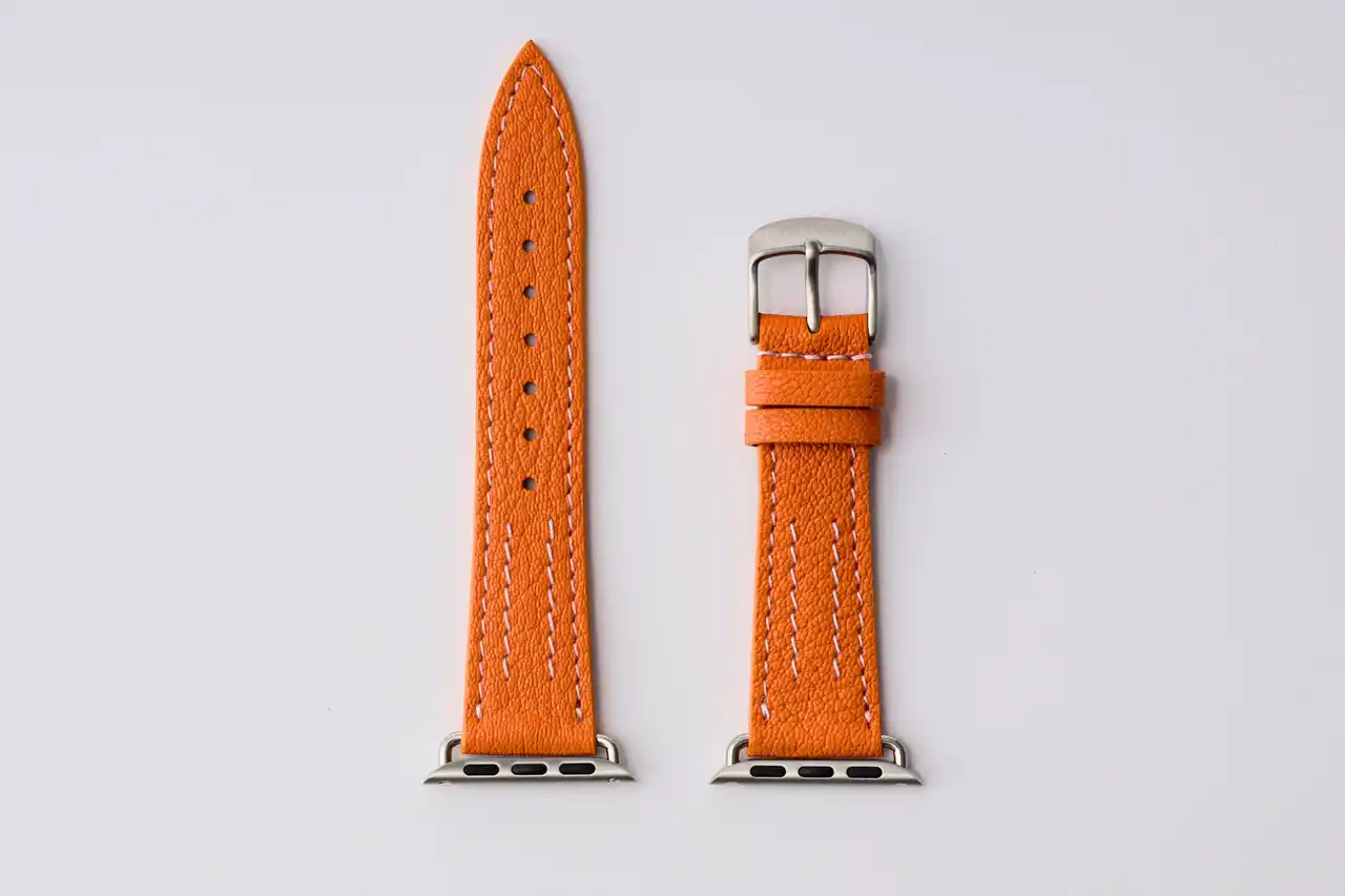 華やかなオレンジカラーのバンドにシルバーのステッチを合わせています。 |