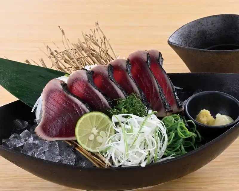鮮度抜群の鰹を香ばしく炙り、しっとりした身の旨みをさらに引き出します。塩のまろやかさと、ぽん酢のさっぱりとした酸味が、鰹本来の濃厚な味わいを引き立てます。 |