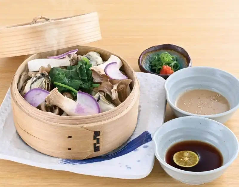 広島県産の“牡蠣”と3種の“きのこ”をふんだんに盛り、蒸籠(せいろ)でふっくらと蒸し上げます。素材の風味をそのまま楽しめる一品で、味わいのアクセントに、「ぽん酢」と「胡麻だれ」の2種類のタレをご用意しました。 |