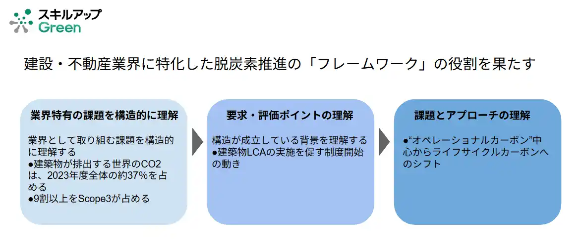 人材育成を通じて企業の脱炭素経営を支援する株式会社スキルアップNeXt(本社:東京都千代田区、代表取締役:田原 眞一、以下「スキルアップNeXt」)は、研修プログラム「GX入門講座」のオプションカリキュラムとして、主要16に特化した「業界別講座」の提供を開始します。第一弾として、建設・不動産業界に特化した脱炭素の入門講座を本日より提供します。 |