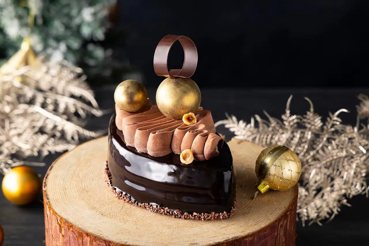 クリスマスツリーに見立てたチョコレートガナッシュに、ゴールドが上品なチョコレートオーナメントをあしらった、フランス語で「モミの木の飾り」を意味するチョコレートケーキ。ダークチョコレートの酸味とオレンジのアクセントをほど良く効かせたチョコレートムースの中に、チョコレート生地とカラメリゼしたヘーゼルナッツのムースを重ね、濃厚で深みのある味わいに仕上げました。 |