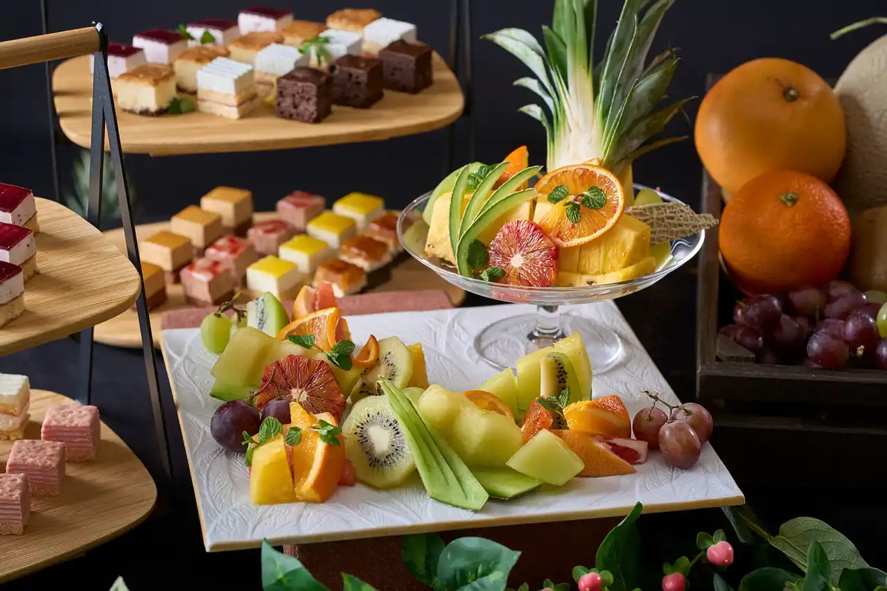 また、デザートも充実。市場直送の旬のフルーツの盛り合わせや、フルーツショートケーキをはじめとする10種類以上のケーキなど、一度のご利用では食べ切れないほどのデザートを取り揃えました。ハーゲンダッツ アイスクリームはバニラ・グリーンティー・ストロベリーの人気3種をご用意いたします。 |