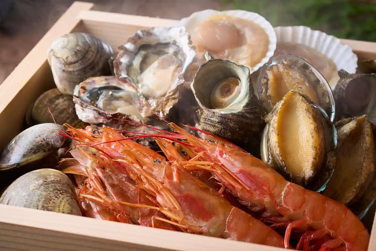 左)お席で蒸したて熱々をお召し上がりいただける海鮮浜蒸し。ホタテやアワビ、サザエ、牡蠣など豊富な魚介類をご用意しております。 |