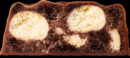 商品パッケージに掲載しているお菓子の写真が、顔のように見えることがありました。これはブラックサンダーの中にある白いプレーンビスケットがチョコレートの中に点在することで、目のように見えて顔らしく見えます。ブラックサンダーはビスケットとチョコレートと混ぜてカットしているため、断面に現れるビスケットの砕け方や配置はランダムで、同じように見えても全く同じものは存在しません。 |