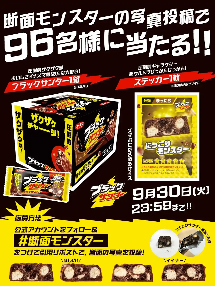 「ブラックサンダー断面モンスター」を発見してくれた方の中から抽選で96名様に、ブラックサンダーと断面モンスターオリジナルステッカーが当たるXキャンペーンを開催いたします。詳細はブラックサンダーの公式Xアカウントの投稿をご確認ください。 |