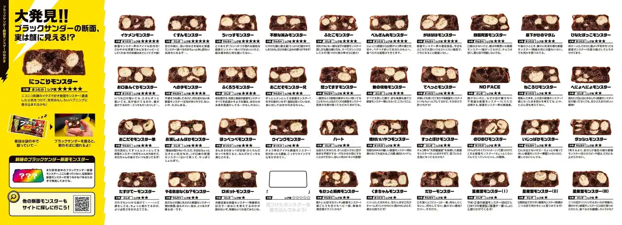 「ブラックサンダー断面モンスター」とは、ブラックサンダーの中に潜む個性豊かなモンスターたちのことです。普段はチョコバーの中で眠っていますが、ブラックサンダーを割ることで見つけることができます。ただし、見つけられるかどうかは、あなたの運と想像力、そしてブラックサンダーへの愛にかかっています。これまでに確認された全40種類におよぶ“ブラックサンダー断面モンスター図鑑”を特設サイトで公開しています。どんなモンスターたちに出会えるでしょうか。“もう顔にしか見えない”奇跡の断面に出会えたあなたは、もしかするととても運がいいのかもしれません。ぜひ、自分だけの「ブラックサンダー断面モンスター」に名前をつけて、SNSでシェアしてみてください。 |