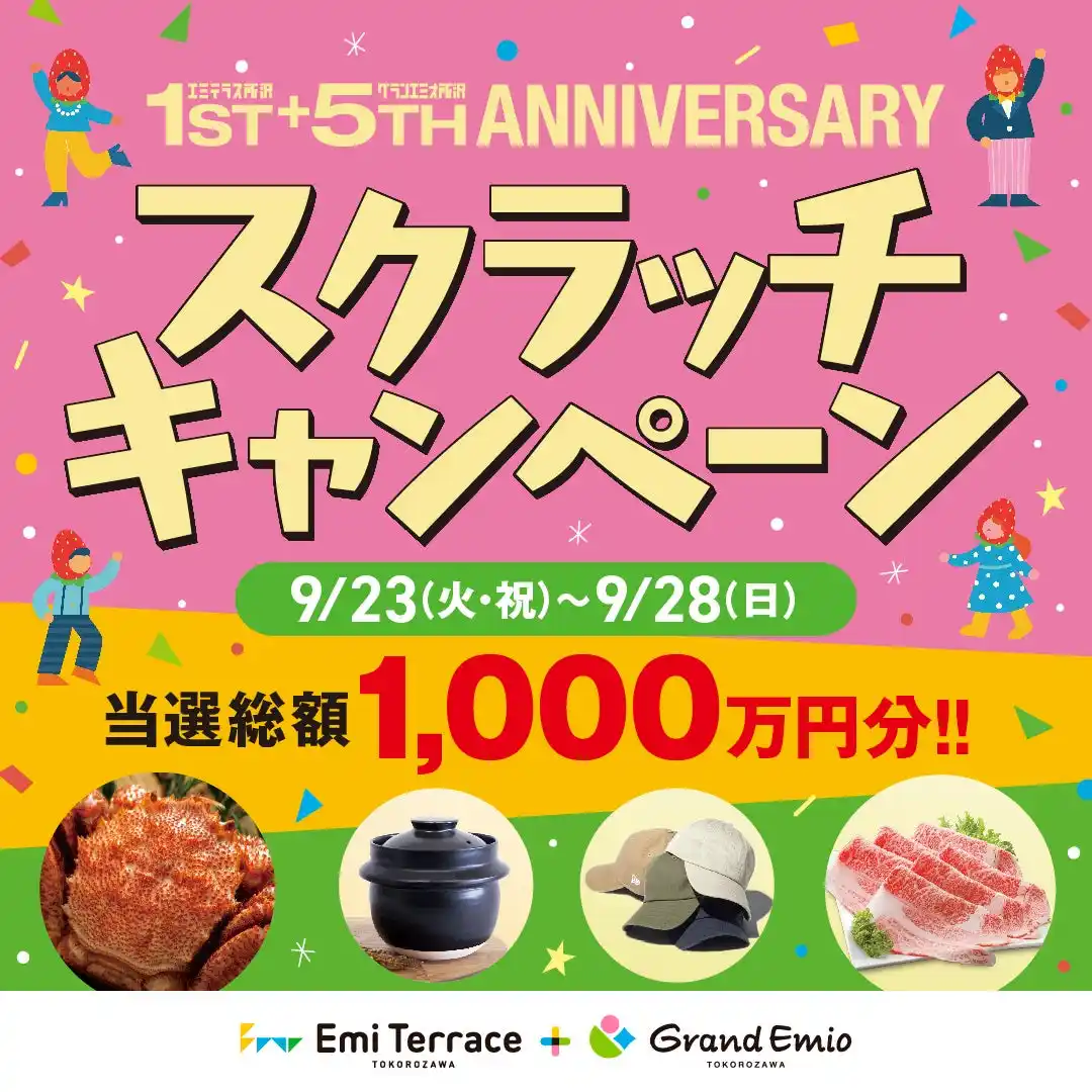 「エミテラス所沢」「グランエミオ所沢」(埼玉県所沢市/運営:住商アーバン開発株式会社)は、 『エミテラス所沢1st+グランエミオ所沢5th ANNIVERSARY』(以下、本フェア)を2025年9月12日(金)~9月28日(日)まで開催します。所沢スタイルを創造・発信する「エミテラス所沢」と所沢駅直結で利便性の高い「グランエミオ所沢」。本フェアは、1周年+5周年のアニバーサリーを記念して、2つのパーティーとたくさんのハッピーを皆さまにお届けします。 |