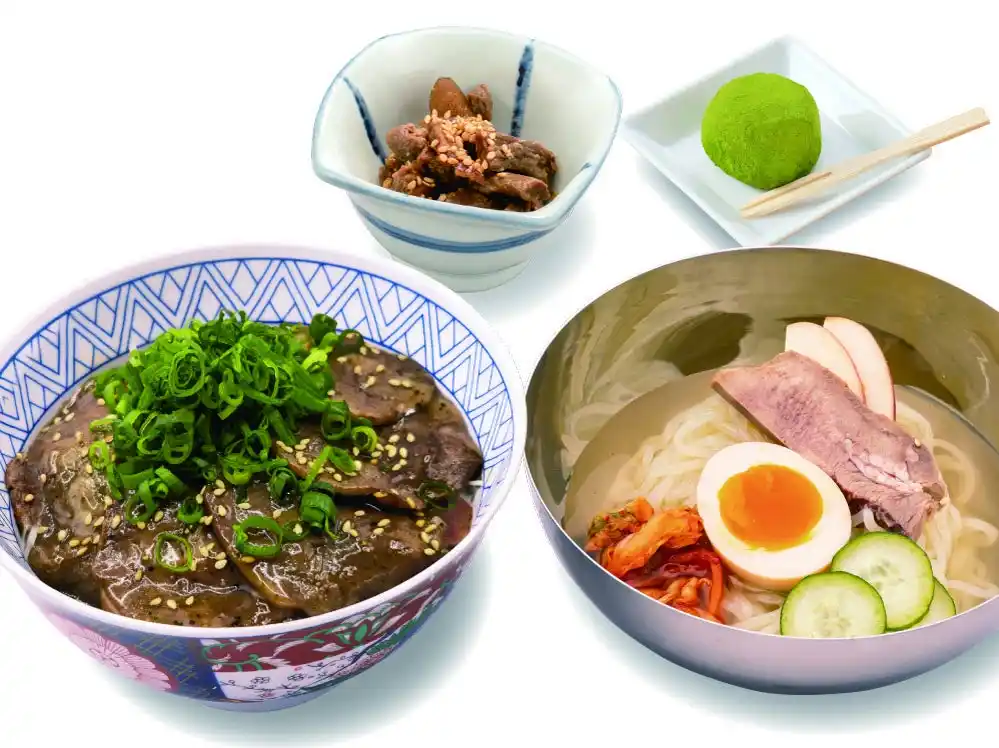 薄切り牛たんがたっぷり8枚のった牛たん丼とハーフ冷麺がセットに!大福と牛たんの佃煮が付いたお得な定食。 |