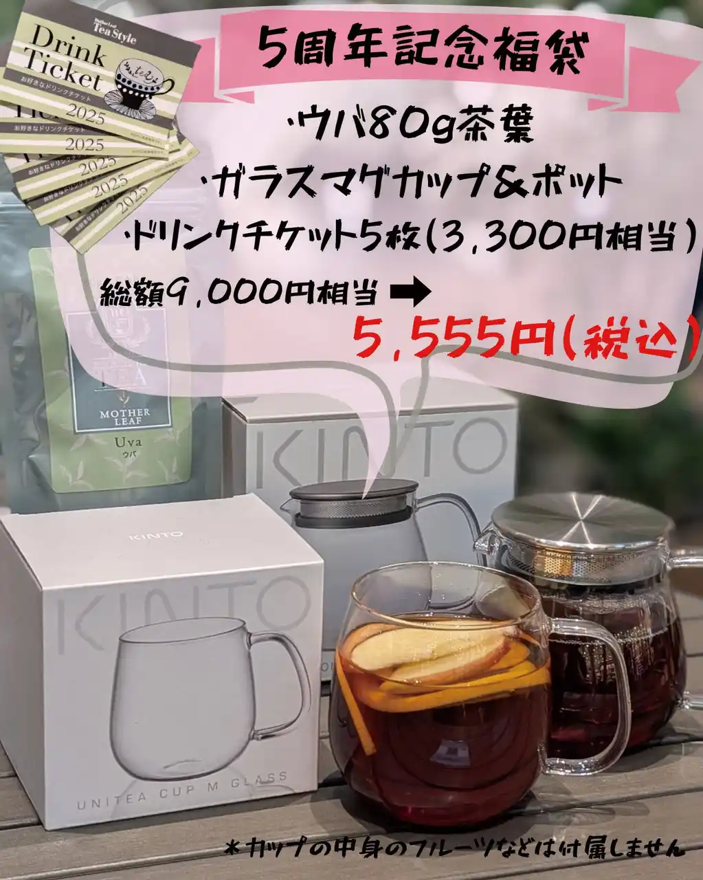 ウバ80g茶葉やマグカップ&ポットのセット、さらにドリンクチケットが5枚も入った、通常販売価格よりもお得な福袋。 |