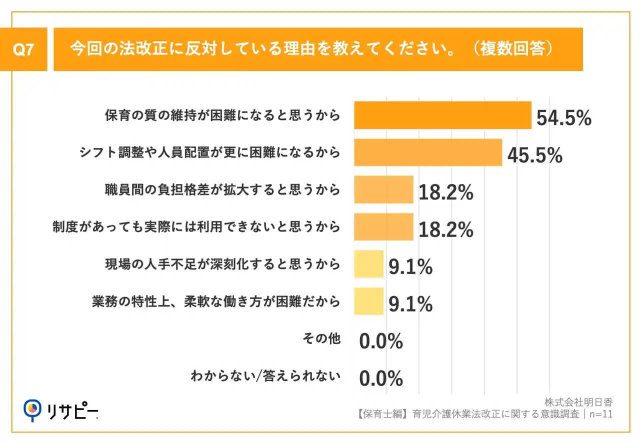 Q5で「やや反対」「反対」と回答した方に、「Q7.今回の法改正に反対している理由を教えてください。(複数回答)」(n=11)と質問したところ、「保育の質の維持が困難になると思うから」が54.5%、「シフト調整や人員配置が更に困難になるから」が45.5%という回答となりました。 |