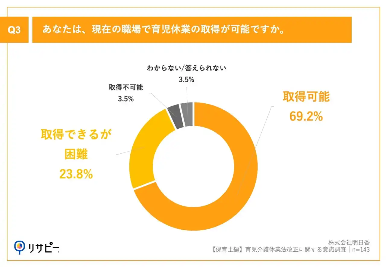 「Q3.あなたは、現在の職場で育児休業の取得が可能ですか。」(n=143)と質問したところ、「取得可能」が69.2%、「取得できるが困難」が23.8%、「取得不可能」が3.5%という回答となりました。 |
