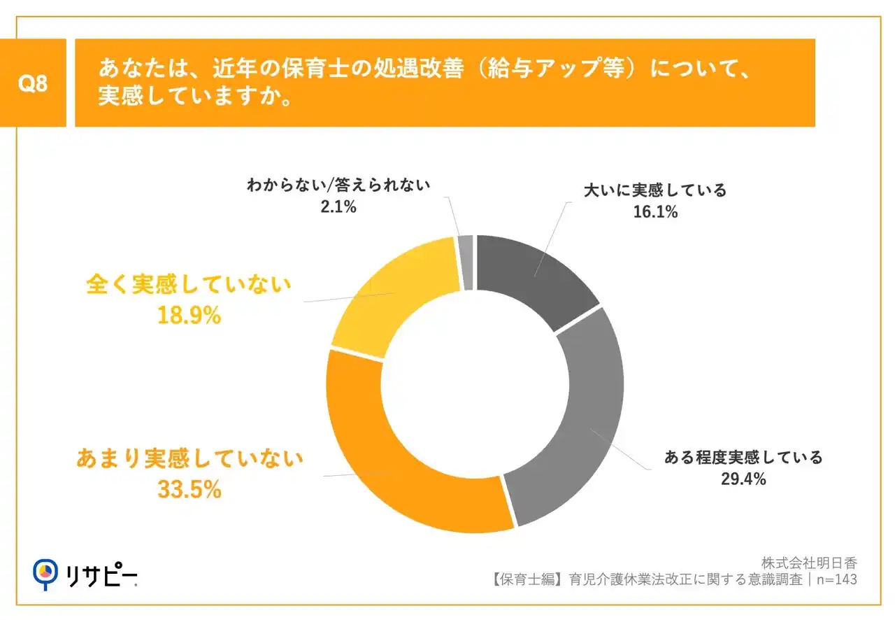 「Q8.あなたは、近年の保育士の処遇改善(給与アップ等)について、実感していますか。」(n=143)と質問したところ、「あまり実感していない」が33.5%、「全く実感していない」が18.9%という回答となりました。 |