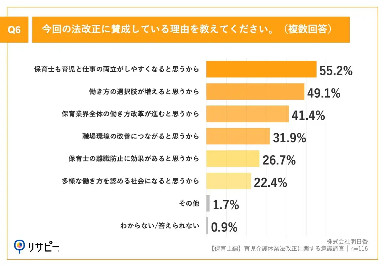 Q5で「賛成」「やや賛成」と回答した方に、「Q6.今回の法改正に賛成している理由を教えてください。(複数回答)」(n=116)と質問したところ、「保育士も育児と仕事の両立がしやすくなると思うから」が55.2%、「働き方の選択肢が増えると思うから」が49.1%、「保育業界全体の働き方改革が進むと思うから」が41.4%という回答となりました。 |