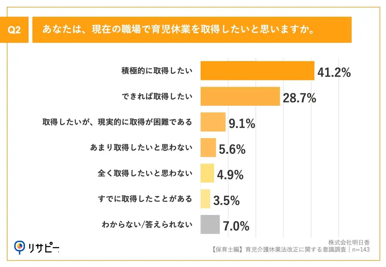 「Q2.あなたは、現在の職場で育児休業を取得したいと思いますか。」(n=143)と質問したところ、「取得したいが、現実的に取得が困難である」が9.1%、「あまり取得したいと思わない」が5.6%、「全く取得したいと思わない」が4.9%という回答となりました。 |