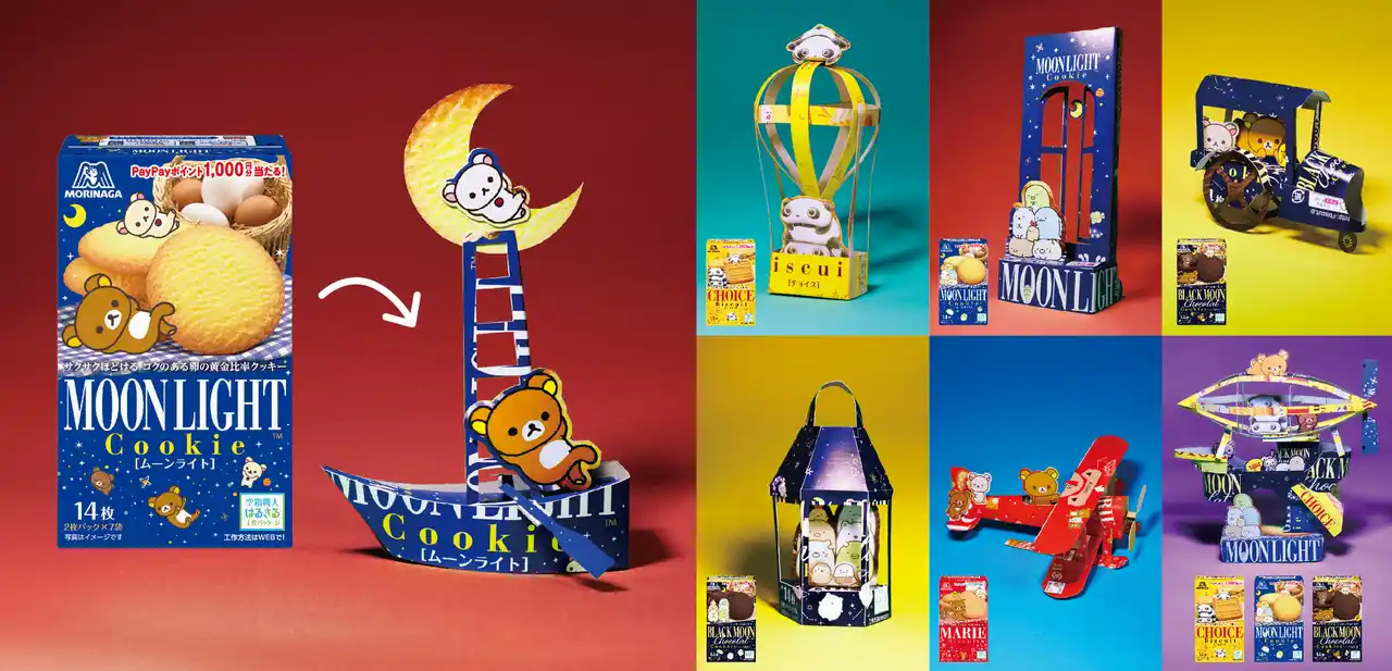 「マリー」、「チョイス」、「ムーンライト」、「ブラックムーン」には、パッケージの中面に工作の図面が印刷されていて、食べたあとの空箱が、創造力を刺激する楽しい工作キットに早変わり。同じビスケットでもそれぞれ2種ずつ異なるキャラクターコラボパッケージがあるので、キャラクターごとに異なる空箱工作を全8種楽しむことができます。 |