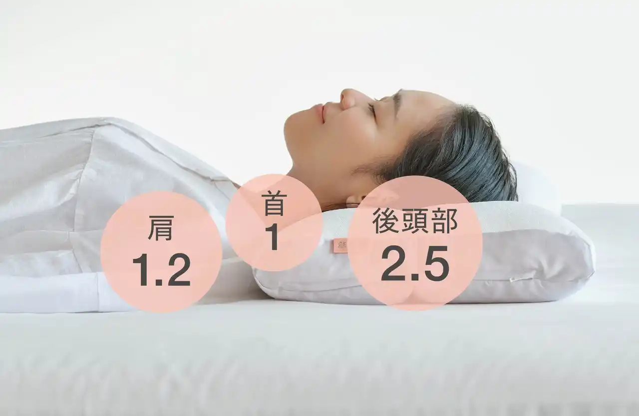 「医師がすすめる健康枕」は、nishikawaと整形外科医 奥山隆保先生※との共同研究で誕生したまくらシリーズです。後頭部・首・肩の三点を支える「三点支持理論」に基づいた立体設計。「肩1.2:首1:後頭部2.5」の圧力バランスで支え、頚椎のS字カーブを正しくキープし、理想的な寝姿勢を保ちます。 |