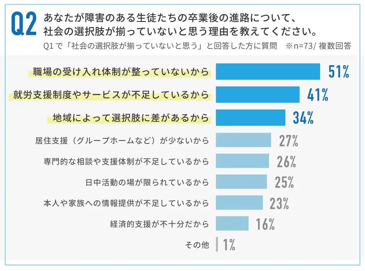 今回の調査では、障害のある生徒の卒業後の進路において、7割以上の教員が「社会の選択肢が揃っていない」と回答しました。その最大の理由は、「職場の受け入れ体制が整っていない」(50.7%)という点です。 |
