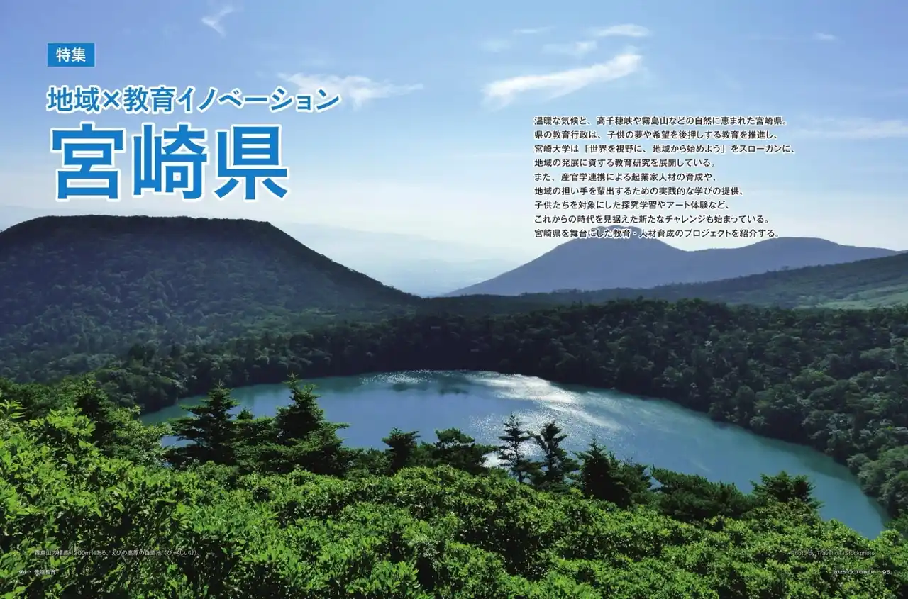 温暖な気候と、高千穂峡や霧島山などの自然に恵まれた宮崎県。県の教育行政は、子供の夢や希望を後押しする教育を推進し、宮崎大学は「世界を視野に、地域から始めよう」をスローガンに、地域の発展に資する教育研究を展開しています。また、産官学連携による起業家人材の育成や、地域の担い手を輩出するための実践的な学びの提供、子供たちを対象にした探究学習やアート体験など、これからの時代を見据えた新たなチャレンジも始まっています。宮崎県を舞台にした教育・人材育成のプロジェクトを紹介します。 |