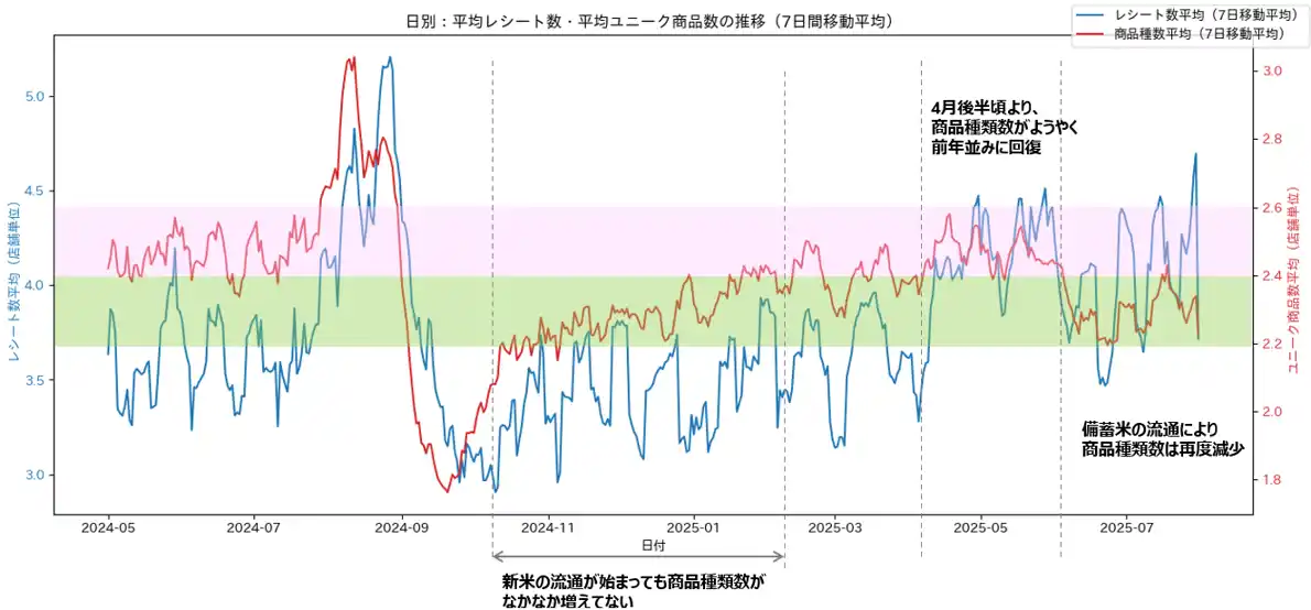 「スマートレシート(R) 」の分析データを見ても上記事象は顕著に確認されており、新米流通が始まっても商品種類数の回復は鈍く、前年水準に戻るまでには翌年4月後半までの時間を要していたことが明らかになっています。さらに、備蓄米の市場投入が行われたタイミングでは、再び商品種類数が大きく減少。こうした供給調整の動きは、消費者にとって「選択の範囲」が限られることに直結しており、購買行動や市場の安定性に少なからず影響を与えていることが示唆されました。 |
