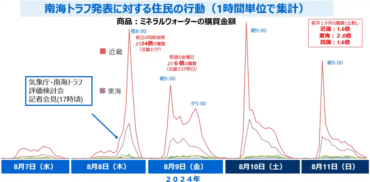 南海トラフ地震臨時情報の発表直後には、ミネラルウォーターの購買量が一時的に急増していた動向が捉えられています。 |