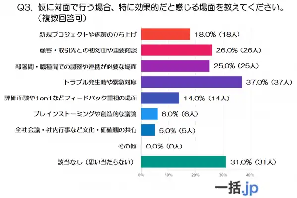 最も多かったのは「トラブル発生時や緊急対応」で37.0%(37人)を占め、予期せぬ事態においては迅速かつ確実な意思疎通が求められるため、対面でのやり取りが重要視されていることが分かります。