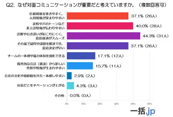 最も多かったのは「誤解や行き違いが起こりにくく、意思疎通がスムーズ」で44.3%(31人)を占め、対面コミュニケーションの最大の価値は認識の齟齬を防ぎ、確実な情報伝達を可能にする点にあることが分かります。やはり正確さを求める場面では、オンラインよりも対面の方が安心感が強いといえるでしょう。