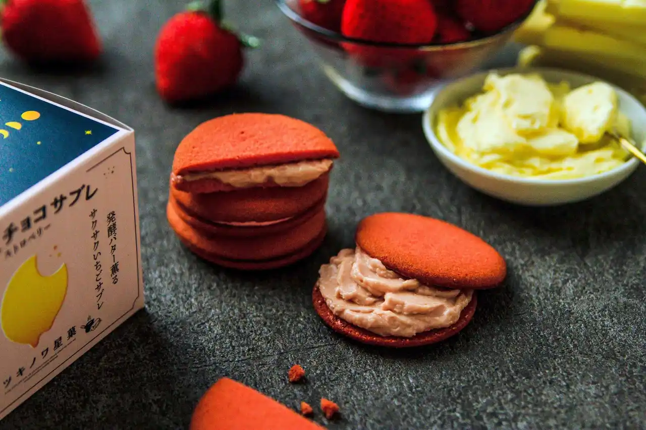 | 華やかに香るいちごチョコクリームを発酵バター薫るサクサクいちごサブレでサンドしています。 | |||||||||||
