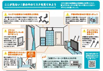 地震が発生した際、家具の固定や転倒防止対策を行っていないと、ケガはもちろん避難の妨げや火災につながるリスクがあります。特に地震によるケガの約3割から5割は、家具類の転倒等によるものです。この機会に改めて、ご自宅の部屋を確認してみましょう。 |