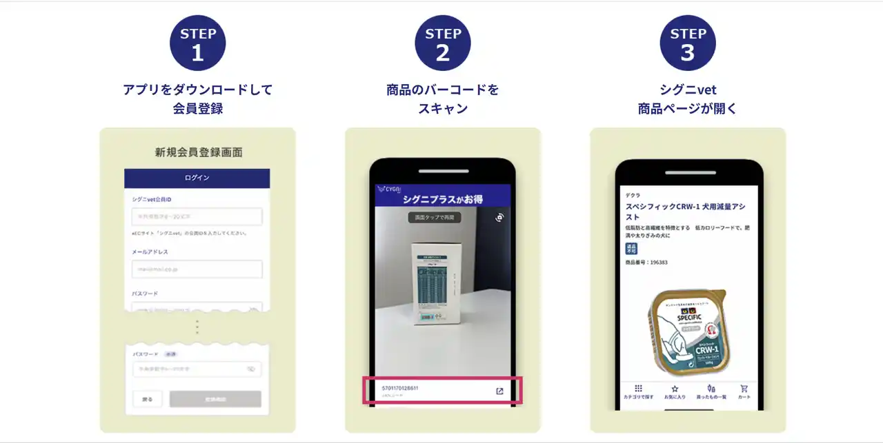 | 本アプリは、動物病院で使用される商品のバーコードを読み取ることで、入力が煩雑で間違えやすい医薬品等の商品名を手入力することなく、シグニが運営する通販サイト「シグニvet」で該当商品を即座に検索・表示できるツールです。2025年7月にリリースされたモバイル専用サイト「シグニvet」とも連携し、従来以上にスムーズな発注が可能になりました。 | |||