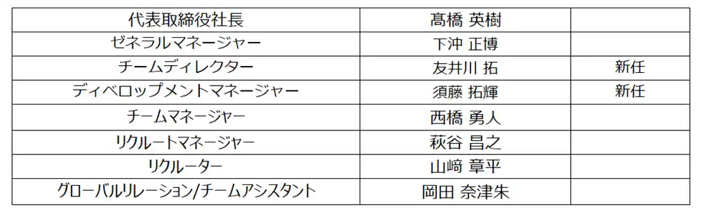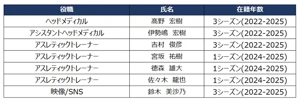 | この度、2025-26シーズンの新体制ならびに2024-25シーズン退団スタッフを下記の通りお知らせいたします。 | |||
